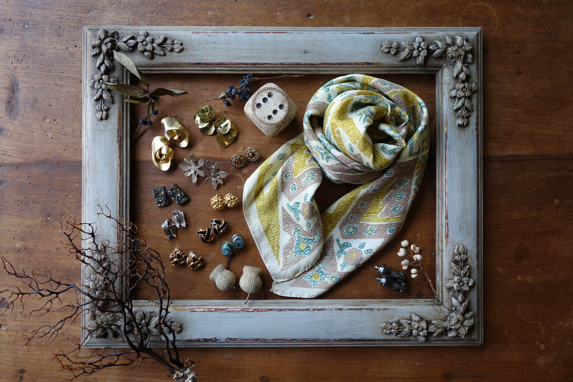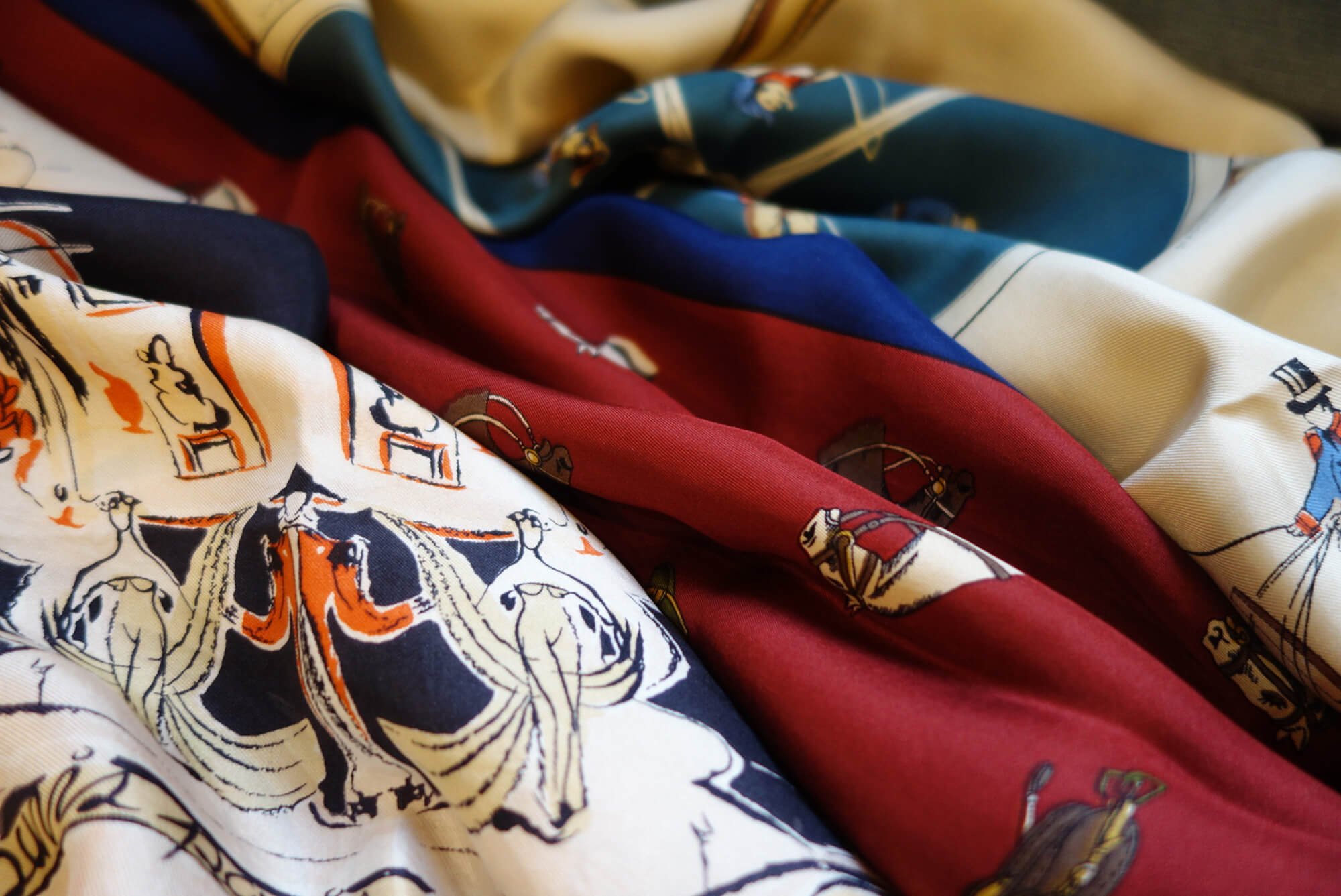 オーナー自らフランスで直接買い付けを行い、状態の良い1960年代を中心に“古き良き時代”のシルク素材にこだわり、一枚一枚を直感と感性で選んでおります。